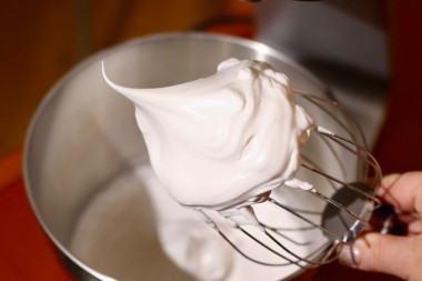 Продолжайте взбивать все вместе еще 2-3 минуты до появления крепких устойчивых пиков. Хорошо взбитая белковая масса станет плотной, гладкой и блестящей. При переворачивании миски белки из нее не должны выпадать. Она должна словно прилипнуть к миске и не двигаться, что бы вы ни делали с миской. Если взбиваете долго,масса загустела, но все равно остается текучей, то либо в нее попал желток, либо вода и скорее всего придется переделывать все заново.