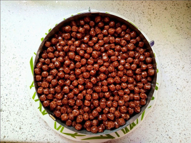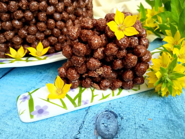 Давно обратила внимание на этот простой в приготовлении тортик. А на 1 июня дети попросили сделать не обычный торт, а из шоколадных шариков, где-то в интернете видели такой. За основу взяла рецепт торта из кукурузных палочек со сгущенкой на скорую руку. В принципе это те же палочки, только в виде шариков и сверху шоколад. Но они немного твёрже. По совету автора сгущенку решила варить сама) Правда варила я ее три часа, помню как моя мама так делала. Вроде сгущенка хорошего качества была, но получилась она не сильно густая, скорее как густая карамель. Смешала ее с мягким маслом венчиком и залила шарики. Всего у меня ушло где-то 350-400 г. шариков на эту сладкую карамельную массу. Формировала в раздвижном кольце, пленкой не выкладывала, торт и так прекрасно вышел из формы. Застывал он ночь в холодильнике. Форму торт держит хорошо, шарики склеились. А ещё они стали мягче. По сладости просто отлично, сами шарики не очень сладкие были. Если делать этот торт из желтых палочек, то посоветую брать без сахарной обсыпки, иначе может быть очень приторно. Но это индивидуально, конечно, кто-то любит послаще) В общем торт нам понравился, особенно дети довольны. В меру сладкий, очень приятный карамельный вкус.