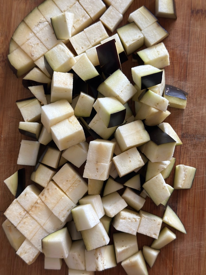 Баклажаны нарежьте мелкими кубиками прямо с кожицей.Шаг 3: