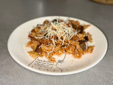 Макароны (любые на ваш вкус) отварите в большом количестве подсоленной воды до готовности или полуготовности (аль денте). Готовые макароны добавьте к баклажанам, всыпьте туда же горсть натертого пармезана (можете добавить другой твердый сыр или не добавлять совсем), тщательно все перемешайте и сразу подавайте к столу.Шаг 8: