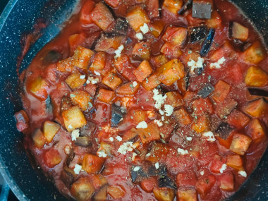 Чеснок и листья базилика нарубите ножом мелко и добавьте к баклажанам. Приправьте солью, перцем и, если помидоры кислые, добавьте щепотку сахара.Шаг 7: