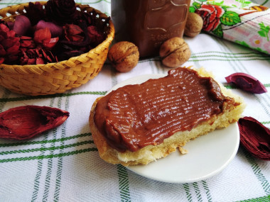Шоколадную пасту мы всей семьей любим. Готовлю по разным рецептам, в этот раз воспользовалась вот этим. На настоящую Нутеллу не очень похоже, ведь в ней нет всевозможных химических добавок, но шоколадная паста просто супер. Мне нравится вот такой вариант с крахмалом, думаю, в следующий раз побольше его добавлю. Сначала масса никак не уваривалась, была жидкой, но потом начала очень быстро густеть и становиться однородной. После добавления масла паста стала гладкая и блестящая. Вместо фундука добавила молотые грецкие орехи. Пасту переложила в банку и охладила. На утро мы завтракали бутербродами с вкусной натуральной шоколадной пастой) Очень вкусно и шоколадно!