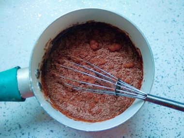 В кастрюле смешайте сахар, просеянную муку, какао-порошок и щепотку соли. Всё о выборе кастрюли, муки и какао-порошка читайте в статьях под рецептом.