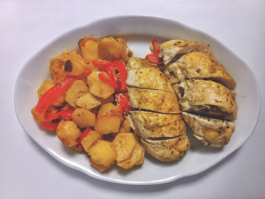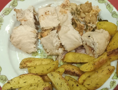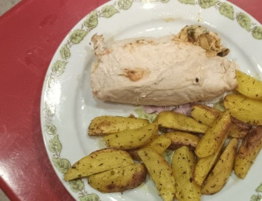 Сегодня сделал куриные рулеты с грибами и сыром. Бомбически получилось. Но я внёс некоторые коррективы. Помазал отбитое филе томатным соусом (типа сацибели), вместо куриной приправы - итальянские травы. Шампиньонов не было - заменил пожареными белыми грибами (подваренные и замороженные) . Ну и болгарского перца не было хотел положить вяленые томаты, но забыл. Плюс на гарнир - картошечка запечённая.