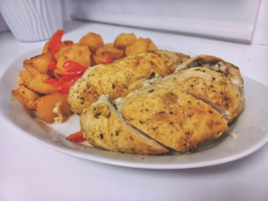 Ещё днём обжарила шампиньоны и замариновала в специях грудку, а вечером приступила к самой ответственной части готовки - заворачиванию рулетиков. Начинки я положила щедро, потому свернуть их удалось не сразу. Можно было воспользоваться деревянными шпажками, но их у меня не оказалось. На помощь пришла кулинарная нить. Обмотав фаршированную грудку, плотно завернула её в фольгу и отправила в духовку. Туда же поместила картошку в рукаве на гарнир вместе с оставшимся болгарским перцем.