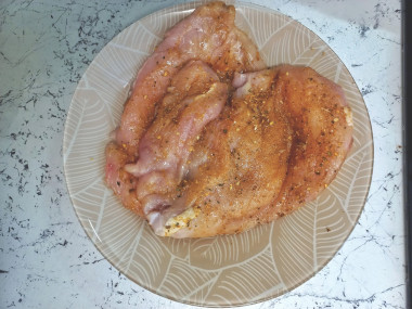 Филе посолите, поперчите, посыпьте специями для курицы и оставьте на 20-30 минут. Специи можете брать любые на ваш вкус.