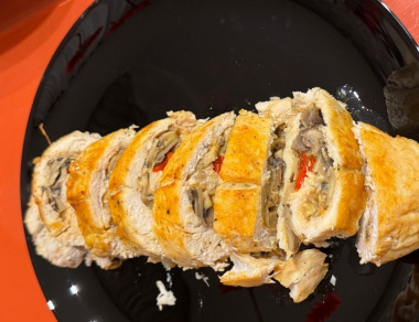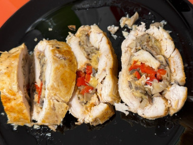 Курица получается нежной и очень вкусной, а начинка с перцем, грибами и с сыром придает необычный вкус, сочетается с нежным куриным мясом. Куриные рулетики с грибами и сыром в духовке просто идеальное праздничное блюдо. Большое спасибо за рецепт!
