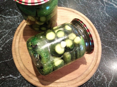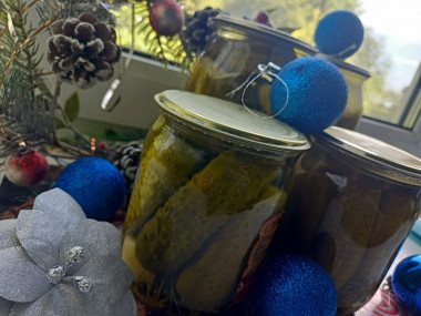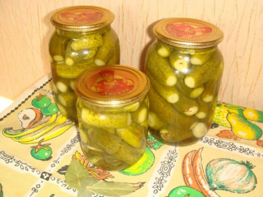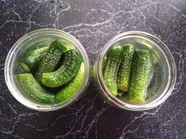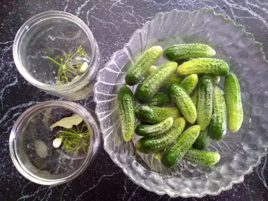 Прелестные огурчики на фото и мне захотелось тоже пару баночек закатать маленьких огурцов. Выбрала в теплице самые мелкие огурцы, хватило на две пол литровые баночки) а готовила по рецепту, как на литровую банку, чтоб не пересчитывать количество ингредиентов. Сначала мои огурчики простояли в холодной воде по совету автора, только простояли немного дольше, чем пару часов, если честно время я не засекала, так как занималась другими заготовками)