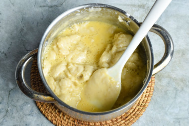 В сотейник влейте воду, добавьте соль, сливочное масло и сахарную пудру. Пудру можно заменить обычным сахаром или сахарозаменителем, который не боится термической обработки. Поставьте сотейник на средний огонь и доведите его содержимое до кипения, постоянно помешивая. Сливочное масло должно полностью раствориться.