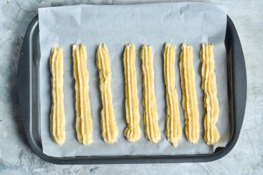 Десерт можно приготовить и в духовке. Застелите противень пергаментом. Выдавите через кулинарный мешок заготовки. Выпекайте в разогретой до 200 градусов духовке примерно 12-15 минут до золотистости. Учитывайте, что время и температура выпекания может быть изменена, так как духовка у каждого печет по-разному.