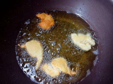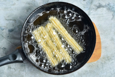 В глубокую кастрюлю с толстым дном влейте растительное масло с высокой температурой дымления. До краев посуды (на 2-3 см) не доливайте, иначе горячие брызги будут разлетаться во все стороны. Разогрейте масло на среднем огне. Как узнать, что фритюр разогрет достаточно? Опустите деревянную лопатку в горячее масло. Если вокруг собрались пузырьки, значит готово. Выдавите в горячее масло тесто в виде полосочек или в форме подковы. Жарьте до золотистого цвета.