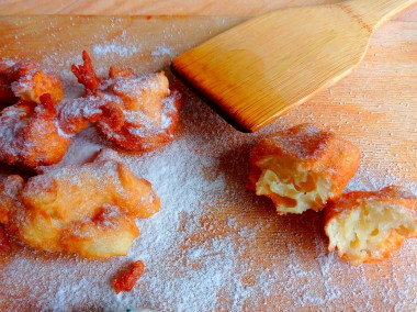 Тесто замешивается несложно и достаточно быстро. Вместо рома добавила коньяк. Специального кондитерского мешка у меня нет, поэтому решила воспользоваться обычным полиэтиленовым пакетом для отсадки чуррос во фритюр. Я сделала две штучки, и получилось как-то неаккуратно, да и в принципе с пакетом не очень удобно. Поэтому в дальнейшем просто вкладывала тесто в масло чайной ложкой.