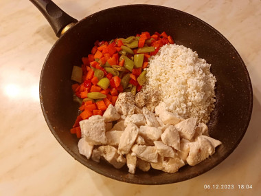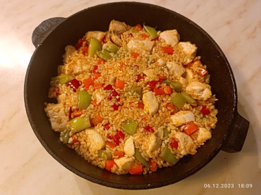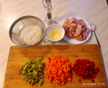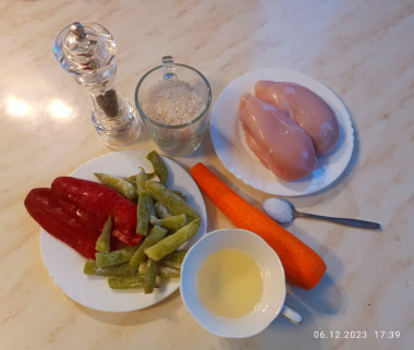 Сегодня на ужин приготовили рис с куриной грудкой и овощами в духовке.