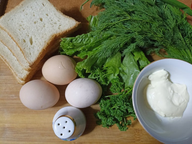 люблю бутерброды. для них нужно брать хлеб ,тостовый или есть специальный для бутербродов. яйца свежие. зелень можно любую кто какую любит. укроп или петрушку, а можно даже и базилик. майонез тоже на любой вкус подойдет даже низко калорийный, можно и сметану но будет немного другой вкус.если не хотите жарить на сковородке можно это сделать в тостере,будет тот же эффект.