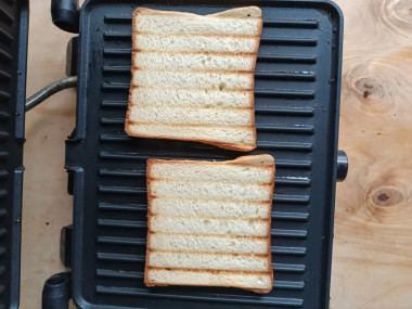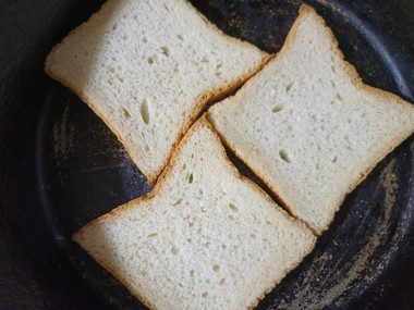 Ломтики хлеба обжариваем на сухой сковороде с одной стороны до золотистой корочки. Обжаривать хлеб не обязательно, но мне нравится хрустящая корочка.