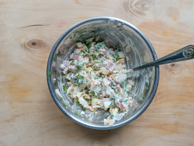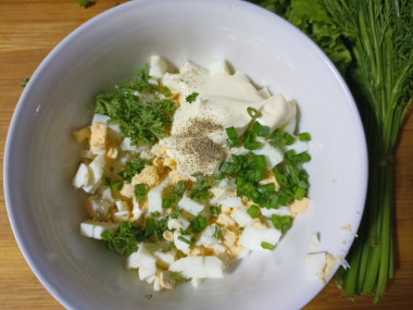 Смешиваем яйца, зелень, майонез, соль и перец. По желанию можете добавить еще немного готовой горчицы.