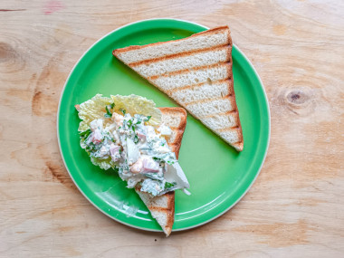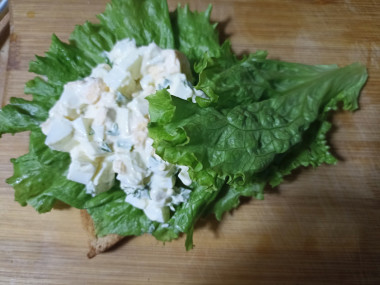 На ломтик хлеба выкладываем лист салата. На салат выкладываем яичную начинку и закрываем вторым ломтиком хлеба.