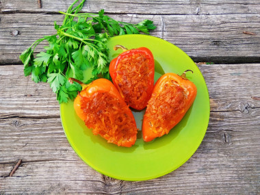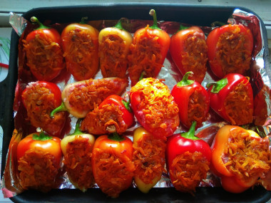 Мне понравилось оформление фаршированных перчиков, очень креативно! Даже в удовольствие было вырезать эти "чашечки") Свиной фарш у меня был жирноватый, поэтому я его разбавила куриным из грудок. А так же добавила немного овощной приправы. Начинка получилась сочной и нежной, ароматной. Поджарка поверх фарша выглядит красиво, к тому же это очень вкусно. Спасибо за рецепт! Перчики яркие, красивые, сочные, вкусные!