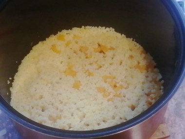 В смазанную чашу мультиварки выложите промытое пшено и тыкву, нарезанную на кусочки. В процессе варки пшено значительно увеличится в объеме, учитывайте это при выборе количества порций.