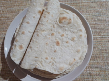 Приготовила домашним мексиканскую лепёшку тортилью. При замесе теста заменила сливочное масло растительным и не стала добавлять разрыхлитель. Тесто получилось мягкое, приятное, податливое.