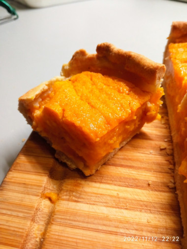 Пирог получился очень нежный, я бы сказала как десерт. Тесто по этой раскладке не совсем удалось, хотя песочное делаю не первый раз. Здесь получилось не такое рассыпчатое, но возможно и к лучшему, т.к. соотношение вкуса сладенькой тыквы и пресноватой корочки хорошо сочетаются.