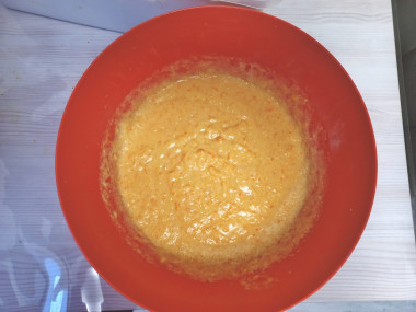 Подготовила основу для теста по консистенции сметаны, добавила туда цедру и измельченные апельсины, отправила всю эту красоту в духовку. Специальной формы для кекса у меня нет, поэтому использовала разъемную для бисквита.