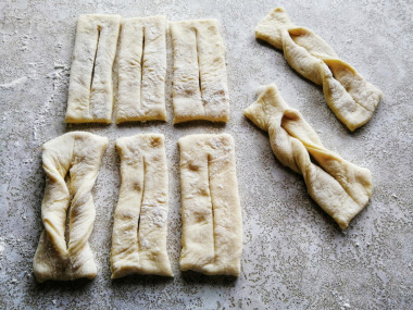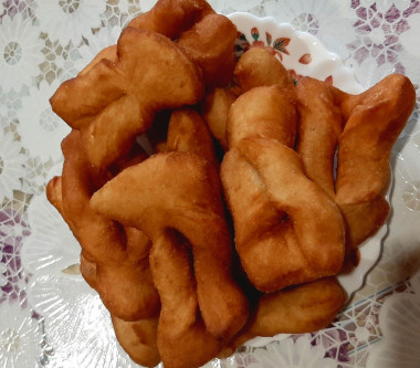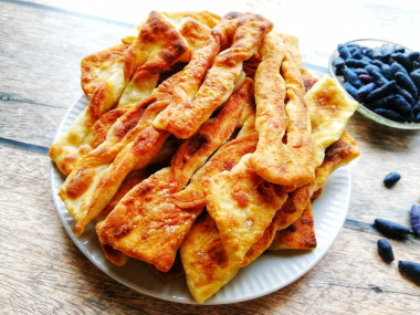 Приготовив тесто, оставила его на 1 час при комнатной температуре, после этого раскатала в пласт толщиной примерно 5 мм, разрезала на прямоугольники, сделала в них надрезы и сформировала кребли. Жарила на растительном масле.