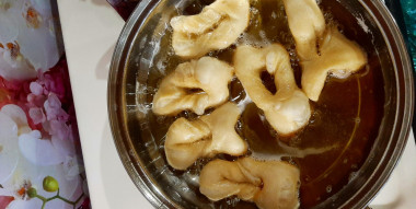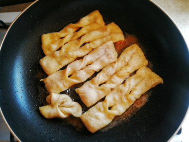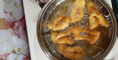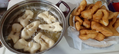 Разогрейте растительное масло в подходящей для жарки посуде — казане или сковороде с высокими бортами. Сделайте огонь средним и начните жарить кребли, выкладывая их порциями по несколько штук. Они должны свободно плавать в масле, чтобы равномерно прожариться. Учитывайте, что кребли увеличатся в размере. Как выбрать сковороду и растительное масло для жарки читайте в статьях на эти темы. Ссылки есть в конце этого рецепта, под шагами.