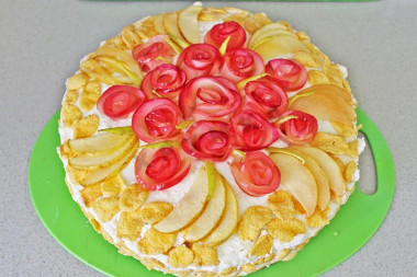Вчера приготовила этот же торт маме на день рождения, но верх украсила по-другому. Розочки делала из долек яблок, как их приготовить, смотрите в рецепте Торт Розовая нежность https://1000.menu/cooking/11551-tort-rozovaya-nejnost. Вот мой фото-отчет