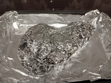 Обмотайте мясо фольгой в 2-3 слоя. Фольга нужна для того, чтобы нога не пересохла и сохранила максимальную сочность. Отправьте в духовку и запекайте при температуре 180-220 градусов до готовности (от 1 часа до двух, зависит от возможностей духовки). В конце приготовления раскройте сверху фольгу (осторожно, не обожгитесь!) и запекайте ещё 10-15 минут, до появления аппетитной золотой корочки. При возможности используйте режим "конвекция".
