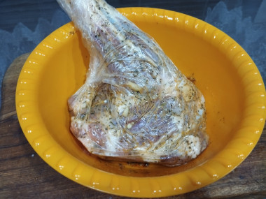 Заверните мясо в пищевую плёнку и отправьте в холодильник мариноваться минимум на час. Чем дольше постоит баранина в маринаде, тем вкуснее и ароматнее она получится. Я часто оставляю на ночь. Перед запеканием выньте ножку из холодильника и оставьте на некоторое время, чтобы она дошла до комнатной температуры.