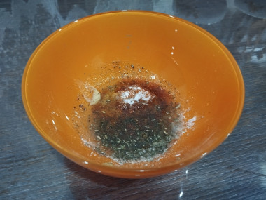 Подготовьте маринад. В глубокой ёмкости смешайте не острую горчицу, оставшийся чеснок, пропущенный через пресс, чёрный молотый перец, розмарин, тимьян, растительное масло и сахар. Выжмите сок лимона. На данном этапе добавьте иные любимые сухие приправы. Не лишними будут щепотка мускатного ореха, молотая красная паприка, сухой базилик, молотый кориандр и проч.