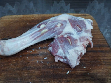 Ногу баранью помыла,обсушила,сняла ножом пленки. Сделала надрезы,в которые вставила пластинки предварительно очищенного чеснока.