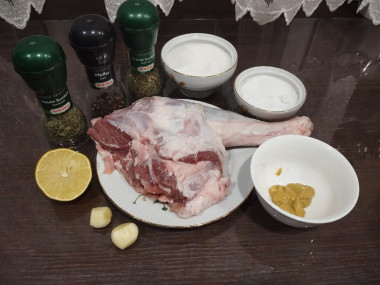 Для маринада смешала соль,перец, горчицу, растительное масло, сушенный сельдерей, прованские травы. Обмазала получившимся маринадом баранью ногу со всех сторон и завернула в пленку. Убрала в холодильник на сутки.