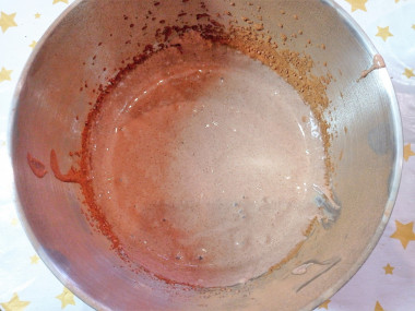 А пока приготовим крем. Взбиваем сметану, постепенно добавляя сахар, смешанный с какао. Ставим готовый крем в холодильник.