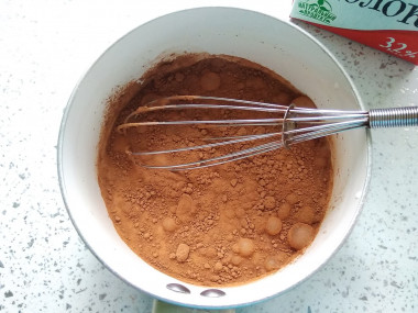 Какао-порошок разводим теплым молоком и водой. Ставим на огонь, доводим до кипения и варим 1-2 минуты.