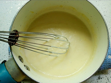 В отдельной посуде подогреваем молоко (но не доводим до закипания) и вливаем его в сковороду тонкой струйкой и небольшими частями. Одновременно перемешивая массу лопаткой. Провариваем смесь на медленном огне около 10 минут, с момента закипания. Нужно, чтобы соус стал однородным по консистенции, без комочков. Для однородности соус можно пробить блендером или венчиком.