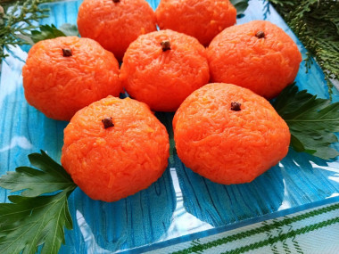 Готовлюсь к новому году и пробую потихоньку разные праздничные блюда. У сына был день рождения, вот и появился повод потренироваться в закусках) Давно уже хотела сделать такие "мандарины". Эта закуска выглядит очень нарядно, ярко, празднично. Продукты все простые, что, конечно, подкупает) Тем, кто будет готовить, советую взять побольше моркови, начинки получается много, а вот шубки мне немного не хватило) У меня вышло семь крупных мандаринов. Вареную морковь натерла на средней терке и отжала сок, которого оказалось довольно много. Просто обвалять шарики в моркови не получилось. Приноровилась класть слой моркови на ладонь, сверху шарик из начинки и покрывала еще одним слоем моркови. Затем уже скатывала полноценный мандарин. Вместо петрушки вставила бутоны гвоздики. Закуску охладила в холодильнике перед подачей. Муж сначала не понял, что это не настоящие мандарины) А на вкус все продукты хорошо сочетаются. Морковка сладкая, чеснок острый, а сырок и яйцо нейтральные. Закуска гостям понравилась, мне тоже. Теперь буду готовить еще такие мандаринки) Рекомендую!