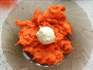 Морковь натереть на мелкой терке. Если нужно - морковь слегка отжать от сока.