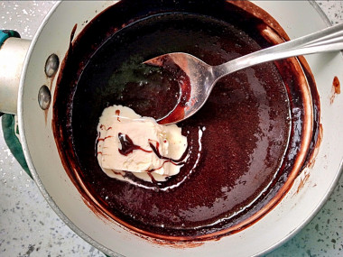 Снимите кастрюлю с шоколадной помадкой из какао с огня, немного остудите, добавьте размягченное сливочное масло и перемешайте до однородности и растворения масла.