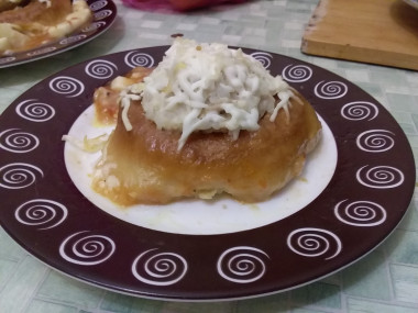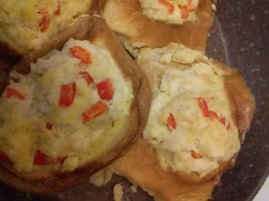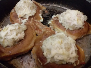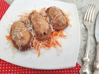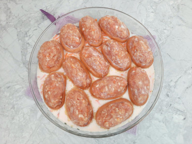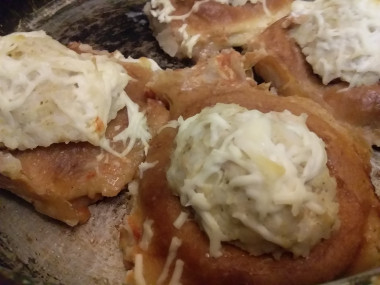 У меня гарчичные баранки запекались в говяжьем бульене с томатным соусом, сверху плвленный сырок, без морковьки, с головкой лука, зубчиком чеснока и чайная ложка хмели сунели. Фарш из куриной грудки разбавлен отварным рисом.