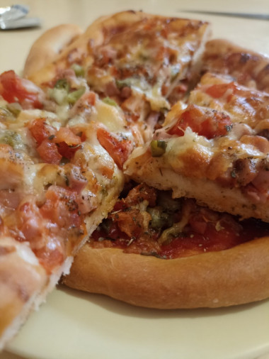 Спасибо большое за рецепт, 3 раз пеку. Начинку правда порезала на кубики , добавила приправу для пиццы( в следущий раз посыплю ей после огурцов а то она подогрела после помидор). Муки ушло где-то 22 столовой ложки (500-550 гр). Тесто разделила на три пиццы.Пекла на 190 градусов 20-25 мин. После смазала бортики сливочным маслом и под полотенце, чтобы смягчилось тесто.