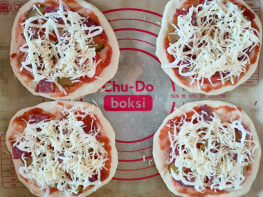 Приготовила сегодня к чаю мини пиццу в духовке по этому рецепту. Дрожжи у меня новые, поэтому добавив их в теплую воду оставила на 10 минут для проверки. Появилась шапочка в миске и пузырики, значит дрожжи хорошие и тесто подойдет. Муки у меня ушло 420 грамм. Тесто поднялось за 40 минут. Из указанного количества ингредиентов у меня получилось 3 пиццы диаметром примерно 14 сантиметров и 6 пицц поменьше. Колбаску взяла сырокопченую, нарезала некрупными треугольниками. Добавила тонко нарезанный репчатый лук. Муж любит пиццу с добавлением лука.