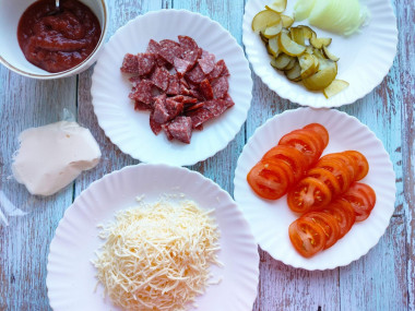 Как сделать дрожжевую мини пиццу в духовке? Подготовьте необходимые ингредиенты. Помидоры помойте. Колбасу нарежьте на тонкие ломтики. Муку высшего сорта необходимо просеять через сито, чтобы насытить её кислородом. Воду нагрейте до теплого состояния (примерно 40 градусов).