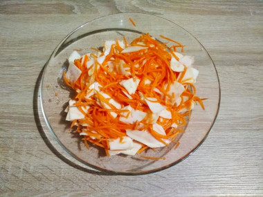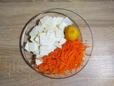 Морковь и корень сельдерея нужно помыть и очистить от кожуры, морковь нарезать соломкой, сельдерей — тонкими ломтиками, перемешать.