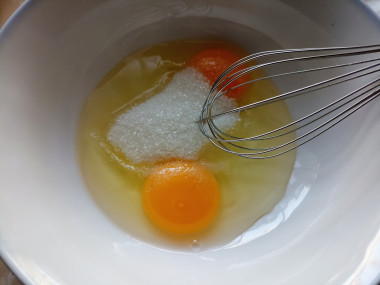 Соедините яйца с сахаром и немного их взболтайте с помощью венчика. Количество сахара можете немного изменить по своему вкусу. Я использую домашние яйца, поэтому они такого насыщенного оранжевого цвета.