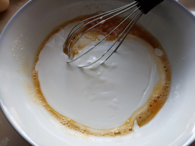 Затем добавьте в чашу необходимое количество сметаны и вмешайте её в тесто.