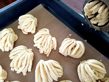 Включите разогреваться духовку до 180 градусов. Противень застелите бумагой для выпечки. Возьмите кусочки охлаждённого теста и пропускайте через мясорубку с крупными ячейками, через 5 см вышедшего теста, обрежьте его ножом или кулинарным шпателем. Выложите печенье на противень небольшими порциями, чуть «прищепив» у основания. Поставьте противень в духовку и выпекайте 15 - 20 минут до румяного цвета.