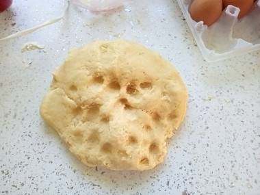 Добавьте в тесто просеянную муку и замесите эластичное тесто. Оно хорошо собирается в шар и не липнет к рукам.