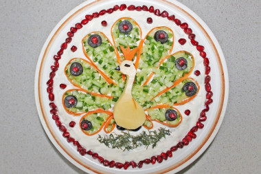 Украсьте салат на свое усмотрение. Я использовала маслины, болгарский перец, вареную морковь, свежий огурец и петрушку. Можно также использовать оставшиеся яичные желтки. Салат жар-птица с курицей и опятами можно подавать сразу либо немного охладить и дать пропитаться. Приятного аппетита!